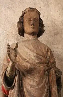 The interior features frescoes, largely purely ornamental of foliage.[1] Church furnishings include a baptismal font and triumphal cross made on Gotland. Also housed is a wooden sculpture of a male saint, traditionally considered a depiction of St. Erik[1][4] but probably Saint Olaf.[2][3] The statue has served as a model for the coat of arms of Stockholm, of which St. Erik is the patron saint.[5] The church has an altarpiece from the early 15th century, one of the oldest in Sweden.[4] In addition, it houses a 14th-century Madonna and a sculpture of Saint Stephen from the 15th century.