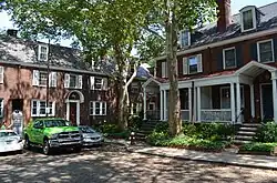 The district was designed by Thomas Rodd in the Colonial Revival architectural style, with significant Georgian Revival influences. Examples of the Colonial Revival style are rare in the city of Pittsburgh. The scale, uniformity, and quality of design are what make Roslyn Place's Colonial Revival elements exceptional.[13] Roslyn Place also has significant Georgian Revival elements, and these can be seen with the symmetrical facades, the hemispherical hoods, the pediment porches, the use of brick, and the coffered design elements on the porches and hoods. The street Roslyn Place is also notable as an example of Nicolson pavement. The neighborhood's design and planning approach is widely recognized, most notably by acclaimed urban planner Allan Jacobs.