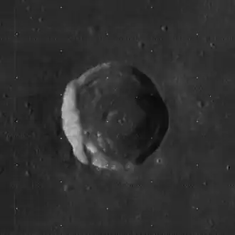This crater has a generally circular shape, but is not quite symmetrical. The inner walls slope down to a base of slumped material, before joining a relatively level interior floor. There is a low ridge to the west of the crater midpoint.
