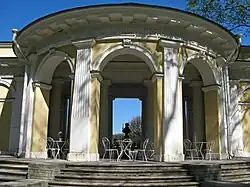 The pavilion sits in the northern end of the Mikhailovsky Garden, on the southern bank of the Moyka River. Designed in the Neoclassical style, it has an open Doric colonnade connecting two square rooms, cast-iron fences, and a pier on the river accessed by two flights of granite steps.[1][2] The pavilion is in the east of the garden, off the centre line of the Mikhailovsky Palace to the south, but aligned with the centre line of the Field of Mars to the north. Explanations for this are either that Rossi had planned a second pavilion to be built to the west, creating a symmetrical view to and from the Mikhailovsky Palace, but the second pavilion was never built; or that it was a deliberate choice by Rossi to connect the Mikhailovsky ensemble with the Field of Mars ensemble on the other side of the river.[2][3][4]
