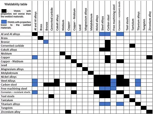 Metallic materials of the same name or dissimilar either composite,[15]superalloys[16] and non-metallic e.g. thermoplastic polymers[17] can be welded and even the welding of wood has been investigated.[18] Weldability tables of metallic alloy can be found on the Internet and in books.[10]