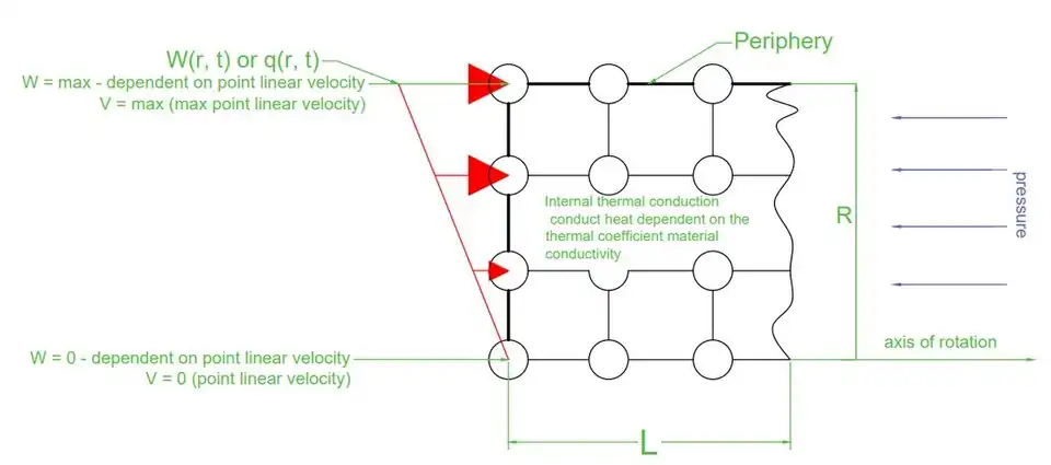 (11) 𝑑𝑞FR(𝑖) = 𝛽FR ∙ 𝑑𝑊FR(𝑖) = 𝛽FR ∙ 𝜏𝑅(𝑖) ∙ 𝜔 ∙ 𝑟𝑖 ∙ 𝑑𝑡 on contacting surface of node 𝑖[30]