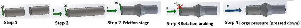 - Step 4, upsetting stage: the welded elements are still forging by forge pressure (pressed down),