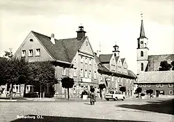 The town suffered once again during the Napoleonic Wars, and in 1815 it became part of the Kingdom of Prussia.[8] From 1816 until 1945 it was the seat of the district of Rothenburg (Ob. Laus.) in the province of Silesia. In 1882, a volunteer fire department was founded.[8] In the late 19th century, the inhabitants were mostly employed in pottery, tile production and farming.[5] In 1907, a rail connection from Horka via Rothenburg to Przewóz was opened.[8] In 1927, a municipal sewage network was established.[8]