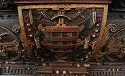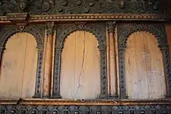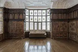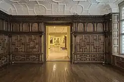 The paneling of the Rotherwas Room is made of walnut, a highly valued imported wood most likely imported from Germany or the Netherlands.[36] While oak was widely used in construction in the Rotherwas estate due to its abundance on the five thousand acre property, large walnut trees did not exist in England prior to 1650 and were rarely used in English paneling if at all.[8] The wainscoting design of lower inner-framed tiers and upper-arcaded panels divided by pilasters and capitals is extremely similar to that of Billesley Manor, Warwickshire and Carbrook Hall, near Sheffield.[37] According to Charles Bodenham, the two doors cut out of the paneling were added in 1611 and 1732 respectively.[38]