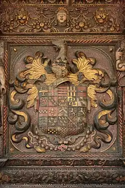 The function of the Rotherwas Room was also related to its decoration, since oftentimes rooms were decorated according to function and the grandest entertaining rooms had the most opulent ornamentation.[25] By the end of the sixteenth and beginning of the seventeenth century, parlors were often almost as lavishly decorated as the great halls in such houses.[26] Furthermore, the decoration of rooms such as this one provided the owners with an opportunity to display their ancestry and allegiance, as well as their knowledge. Thus, coats of arms were usually seen on top of the fireplace, and classical ornamentation along with symbols and emblems would showcase a family's values and cultivation.[29]