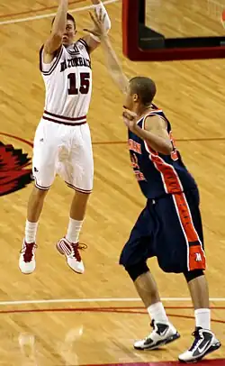 As a transfer, Clarke had to sit out a year before being eligible to play. He used the redshirt year to work on his game, practicing against Butler's Ronald Nored, who was considered one of the top defenders in the country.[2] "I'm not the quickest guy so playing against a defender like that, you find ways to get by, you find different ways to come off a screen," he remarked. NCAA regulations kept Clarke from traveling with the team for road games, so he practiced alone in Hinkle Fieldhouse, refusing to leave until he had made 500 shots on the night.[2] To facilitate his workouts, Clarke persuaded head coach Brad Stevens to give him a key to the building. "At night it would just be me and the ball and basket", he recalls. "That was all that mattered to me. Shooting puts me at ease, it puts me at peace, it takes everything else off my mind."[2] Clarke describes the experience as "definitely one of the toughest years," but credits his teammates and his faith for getting him through it.[22]