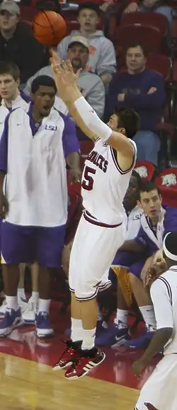 Coming out of high school, Clarke was highly recruited, attracting more than 50 scholarship offers.[3] There was so much interest in Clarke, that he ran up a $400 cell phone bill largely on texts from interested coaches.[3] His bedroom was filled with more than 2,500 recruiting letters.[4] ESPN ranked Clarke as the sixth best point guard, and 52nd best player overall in his recruiting class.[12] Dave Telep, analyst for Scout.com, wrote "He is flat out, without a doubt, the best shooter in the 2008 class".[7] The service rated Clarke as 4-stars.[13] Clarke turned down offers from Gonzaga, Kansas, Kentucky, Memphis, North Carolina, Oklahoma, and Oklahoma State, among others, in order to sign with Arkansas in November 2008.[2][3][11] He liked the school's fans, staff, and facilities, and the fact that he would be able to contribute from day one.[2] Clarke's immediate family relocated to Fayetteville, where his maternal grandmother also lived, to support his career.[2] "My grandma really [worked] on me" to choose Arkansas, he remarked.[7]