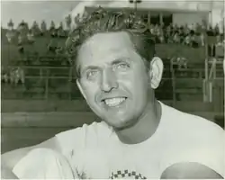 A photo of Roy Tyner in a white T-shirt posing in front of the grandstand of an American speedway. | |||||||