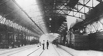 The new route presented problems in Baltimore, because a ferry boat was necessary to cross the harbor between Locust Point and Canton to connect with the B&O's Washington Branch.[3] The solution was the Baltimore Belt Line, which included a 1.4-mile (2.3 km) long tunnel under Howard Street in downtown Baltimore.[9] Work began on the tunnel in 1891 and was completed on May 1, 1895, when the first train traversed the tunnel. To avoid smoke problems from steam engines working upgrade in the long tunnel under the middle of Baltimore, the B&O pioneered the first mainline electrification of a U.S. railroad, installing an overhead third rail system in the tunnel and its approaches.[3][10] An electric locomotive first pulled a Royal Blue train through the Howard Street tunnel on June 27, 1895.[6]