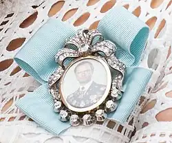 The earliest known Swedish decoration is that of King Oscar II. At that time, Decorations did not have to be attached to the Seraphim blue ribbon that is the case today. As there are no earlier records of royal family decorations in Sweden, it might be assumed that the decorations were not introduced in Sweden until the reign of King Oscar II. Queen Sophia started "Sophiahemmet", a Red Cross nurse training program. At the graduation of the nurses, she presented a miniature portrait of the King on a white ribbon with a red cross. On the back was DSF inscribed in gold enamel on blue background.[3] In the 1900s Gustav V and his wife Victoria made a special form of the order with both of them in the portrait, painted by Fanny Hjelm, as a gift to their friend Countess Anna Brahe (born Anna Nordenfalk) when she visited them.[4] Currently recipients of the order wear it as part of their formal dress, often when their male counterparts wear medals.[5]
