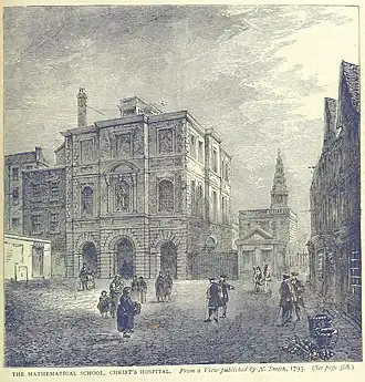 It was established so that potential sailors could learn navigation and mathematicians could train at the school. Samuel Pepys was closely involved in the foundation, in 1673, with Jonas Moore.[1] The School was integrated into Christ's Hospital, with boys who were pupils being selected aged 11 or 12 and prepared for a career in the Royal Navy.[2] There was a short-lived new mathematical school within Christ's Hospital, backed by Isaac Newton, and taught by Humphry Ditton; it ran from 1706 to 1715, when Ditton died, but then was closed down.[3] James Hodgson was master of the Royal Mathematical School from 1709 to 1755, with John Robertson as assistant towards the end of his life. Other masters included James Dodson and William Wales. The master of the early 1760s, Daniel Harris, wrote with John Bevis the manual "Hints for Running the Lines" used by Charles Mason and Jeremiah Dixon for their survey of the Mason–Dixon line.[4]