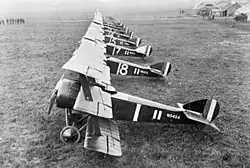 By the outbreak of the First World War in August 1914, the RNAS had 93 aircraft, six airships, two balloons and 727 personnel.[21][22] The Navy maintained twelve airship stations around the coast of Britain from Longside, Aberdeenshire, in the northeast to Anglesey in the west. On 1 August 1915 the Royal Naval Air Service officially came under the control of the Royal Navy.[23] In addition to seaplanes, carrier-borne aircraft, and other aircraft with a legitimate "naval" application the RNAS also maintained several crack fighter squadrons on the Western Front, as well as allocating scarce resources to an independent strategic bombing force at a time when such operations were highly speculative. Inter-service rivalry even affected aircraft procurement. Urgently required Sopwith 1½ Strutter two-seaters had to be transferred from the planned RNAS strategic bombing force to RFC squadrons on the Western Front because the Sopwith firm were contracted to supply the RNAS exclusively. This situation continued, although most of Sopwith's post-1915 products were not designed specifically as naval aircraft. Thus RNAS fighter squadrons obtained Sopwith Pup fighters months before the RFC, and then replaced these first with Sopwith Triplanes and then Camels while the hard-pressed RFC squadrons soldiered on with their obsolescent Pups.[24]