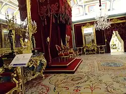 The Empire style wooden bed is mahogany with bronze applications. The vault was frescoed by Jacopo Amigoni and Bartolomé Rusca, highlighting in them allegories of Peace, Justice and Abundance made by Bartolomé Rusca. On the bed is a canvas of christ Cristo en la Cruz by Anton Raphael Mengs of 1761. Also a canvas of 1825 the Madonna and Child by José de Madrazo y Agudo. This room adjoins a small hall.