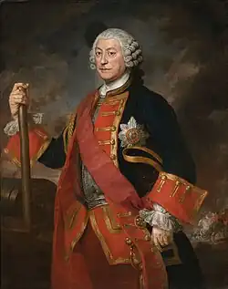 If Granby's grief at his son's loss was saddening, the crippling reductions to The Blues, according to William Pitt the Elder doomed "the bravest men the world ever saw to be sent to starve in country villages and forget their prowess."[11] The harvest failures of the 1760s were compounded by rioting. The Blues were depressed to leave ex-comrades in Germany; they were used as militia for policing duties. Granby died in January 1770, to be replaced by General Seymour Conway as colonel.[12]