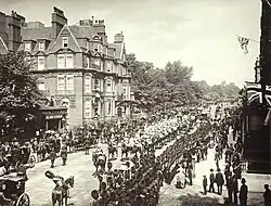Its initial premises was a small apartment on Sloane Street,[1] employing 20 women. She employed Anastasia Marie Dolby as the superintendent and instructor but she died in the following year.[2] Nellie Whichelo was the head designer from the late 1880s.[3] The School received its royal prefix in March 1875 when Queen Victoria consented to become its first patron. It was also an inspiration to Dora Wemyss, who founded the Wemyss School of Needlework in Scotland in 1877 in its image.[4] The school grew to 150 students and moved in 1903 to Exhibition Road, near the Victoria and Albert Museum. The purpose-built building was designed by a group of architects, including prominent British Arts and Crafts architect James Leonard Williams (d.1926).[5] The word "Art" was dropped from the school's title in 1922.[5]