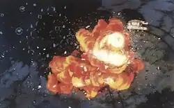 A tank is bombed from above during the climactic battle to capture the launch site, in an explosion animated by the film's special effects artist, Hideaki Anno. Hiroyuki Yamaga and Anno were film students together at the Osaka University of Arts;[144] Anno was the first animator he had ever met, and it was witnessing the "bodily sensation residing" within Anno's explosions that first made Yamaga interested in anime. Even before determining a theme for the project that became Royal Space Force, Yamaga decided the story's climax would feature "Anno's shrapnel".[97]