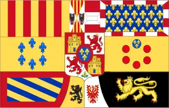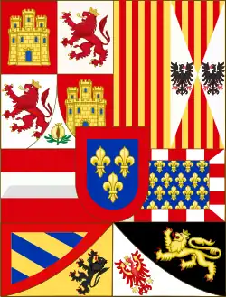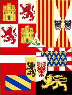 ![]() | 1518–1556 | In 1504, Archduke Philip the Handsome (King of Castile and Leon by marriage with Joanna) immediately staked his claim to her inheritance by quartering his own arms with those of the Catholic Monarchs, the Spanish quarters were given precedence over his. Hence the arrangement became, quarterly: 1. and 4. grand quarters, quarterly: A. and D. quarterly Castile-León, B. and C. per pale Aragon-Sicily, the grand quarter enté en point for Granada; 2. and 3. grand quarters, quarterly Austria, Burgundy ancient, Burgundy modern, Brabant, with an escutcheon per pale Flanders and Tyrol. In 1518 their son Charles I of Spain (Charles V as Holy Roman Emperor) adopted a banner of arms that comprised these arms on a crimson background. The arms were crowned with the old royal crown (an open crown). After his election as Holy Roman Emperor in 1519 Charles used more often the imperial banner: A shield with his own arms surmounting a black double-headed eagle on a golden background.[4] |