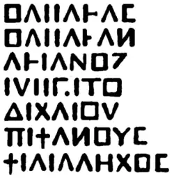 Greek inscriptions similar to "ΒΑΣΙΛΕΩΣ ΒΑΣΙΛΕΩΝ ΑΡΣΑΚΟΥ ΕΥΕΡΓΕΤΟΥ ΔΙΚΑΙΟΥ ΕΠΙΦΑΝΟΥΣ ΦΙΛΕΛΛΗΝΟΣ", meaning "[coin] of king of kings Arsaces, the benefactor (Euergetes), the just (Dikaios), the illustrious (Epiphanes), friend of the Greeks (Philhellen)", are found on coins of the Parthian Empire, starting from the reign of Artabanus I.[1] Some variations of this inscription exist.