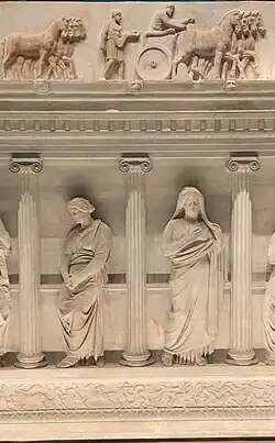 | I | #1 (Mourning women) | | Hellenic style sarcophagus, shaped like an Ionic temple and made of Pentelic marble with polychrome reliefs.[66] The trough stands on a 0.4 m (1.3 ft) pedestal consisting, from bottom to top, of a flat band, a row of egg-and-dart motifs framing an intricate relief depicting a hunting scene, a molding and a final flat band that serves as a plinth. On top of the plinth, a row of 14 Ionic columns and four pilasters enshrine 18 female figures in mourning.[67] The columns are surmounted by an architrave. The trough measures 2.68 m × 1.38 m (8.8 ft × 4.5 ft) and 1.29 m (4.2 ft) high.[67] The lid measures 2.87 m × 1.56 m (9.4 ft × 5.1 ft) and 0.4 m (1.3 ft) high. It features a relief of a funerary procession, pediments, sphinxes, acrtoteria, and nine downspouts in the shape of lion heads.[68] Traces of polychromic paint were still found on parts of the sarcophagus lid and trough.[69] Dimensions according to Hitzl: Trough 2.659 m × 1.385 m (8.72 ft × 4.54 ft) and 1.28 m (4.2 ft) Lid dimensions: 2.789 m × 1.497 m (9.15 ft × 4.91 ft) and 50 cm (20 in) high lid.[70] | Sarcophagus 1: Human remains and the skulls of seven greyhounds and a bronze buckle. [71] Sarcophagus 2 human remains only. [69] |