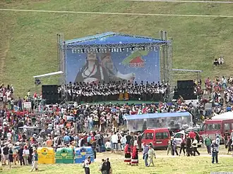 The Rozhen National Folklore Fair (Bulgarian: Национален фолклорен събор „Рожен“, Natsionalen folkloren sabor „Rozhen“) is a major Bulgarian folklore fair held every four years on the meadows of the Rozhen area in Smolyan municipality, Smolyan Province, in the Rhodope Mountains of southern Bulgaria. The fair's goal is to popularize the Bulgarian folk dance and song art and it lasts for two days in August.