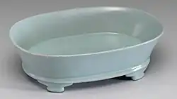 Examination of excavated fragments shows the fired clay body is a light grey colour, sometimes compared to the colour of incense ash. Although stoneware by Western criteria (not a category recognised in traditional Chinese thinking),[19] the wares are fired at a relatively low temperature, and are far from fully vitrified, absorbing water at a "fairly high" rate. Nor is the body free from flaws when examined under magnification. Since it was almost entirely covered by glaze, these issues did not detract from the wares.[20] Some authorities note that the body might really be considered earthenware, though it is always classified by Western writers as stoneware,[21] because of the other Northern Celadons it relates to, and in Chinese terms as "high-fired", usually translated as porcelain.[22]