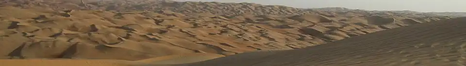 The Rub' al Khali[note 1] (/ˈrʊb æl ˈkɑːli/;[1] Arabic: ٱلرُّبْع ٱلْخَالِي, lit. 'Empty Quarter', [ar.rʊbʕ‿al.χaːliː]) is a desert[2] encompassing most of the southern third of the Arabian Peninsula. The desert covers some 650,000 km2 (250,000 sq mi) (the area of long. 44.5°−56.5°E, and lat. 16.5°−23.0°N), including parts of Saudi Arabia, Oman, the United Arab Emirates, and Yemen.[3] It is part of the larger Arabian Desert.