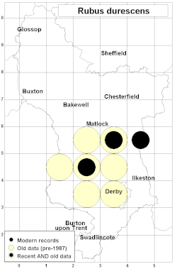 Rubus durescens has deep pink flowers and, according to Linton, "occurs in plenty over an area of some five miles by four to the north and east of Shirley".[5] He recorded the species between Ambergate and Whatstandwell in the north of its range, through Bradley Wood and Duffield in the centre, down to between Church Broughton and Sutton on the Hill in the southern part of its range. The 1969 version of The Flora of Derbyshire, by A.R.Clapham, also noted the plant in Bradley Wood as well as near Cross o' th' Hands.[6] The 2015 version of The Flora of Derbyshire noted that the plant's range had remained unchanged, listing locations at Mugginton Sand Quarry, Nether Heage, Lower Hartshay and Swanwick.[7]: 89