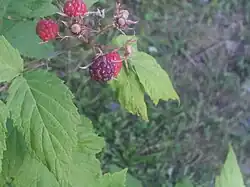 The species has been used in the breeding of many Rubus hybrids; those between red and black raspberries are common under the name purple raspberries; 'Brandywine', 'Royalty', and 'Estate' are examples of purple raspberry cultivars.[11] Wild purple raspberries have also been found in various places in northeastern North America where the two parental species co-occur and occasionally hybridize naturally.