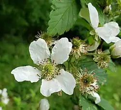 Rubus occidentalis is a deciduous shrub growing to 2 to 3 metres (6.6 to 9.8 ft) tall.[6] The leaves are pinnate, with five leaflets on leaves, strong-growing stems in their first year, and three leaflets on leaves on flowering branchlets. The flowers are distinct in having long, slender sepals 6 to 8 millimetres (0.24 to 0.31 in) long, more than twice as long as the petals. The round-shaped fruit is a 12-to-15-millimetre (0.47 to 0.59 in) diameter aggregation of drupelets; it is edible, and has a high content of anthocyanins and ellagic acid.[7][8]