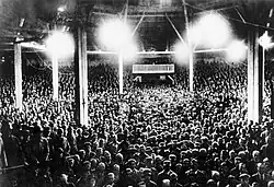 Meanwhile, problems continued with the economy; hyperinflation caused many personal fortunes to be rendered worthless. When the German government failed to meet its reparations payments and French troops marched in to occupy the industrial areas along the Ruhr in January 1923, widespread civil unrest was the result.[36] Hitler decided the time was ripe to attempt to seize control of the government with a coup d'état modelled on Benito Mussolini's 1922 March on Rome.[37] Hess was with Hitler on the night of 8 November 1923 when he and the SA stormed a public meeting organised by Bavaria's de facto ruler, Staatskommissar (state commissioner) Gustav von Kahr, in the Bürgerbräukeller, a large beer hall in Munich. Brandishing a pistol, Hitler interrupted Kahr's speech and announced that the national revolution had begun, declaring the formation of a new government with World War I General Erich Ludendorff.[38] The next day, Hitler and several thousand supporters attempted to march to the Ministry of War in the city centre. Gunfire broke out between the Nazis and the police; sixteen marchers and four police officers were killed. Hitler was arrested on 11 November.[39][40]