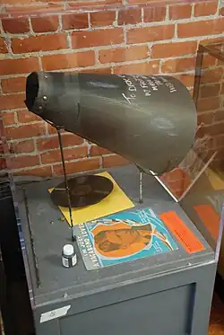 He became one of the first crooners.[8] Singers needed strong voices to fill theaters in the days before microphones. Crooners had soft voices that were suited to the intimacy of radio; the microphones, in this case, promoted direct access to "a vulnerable and sensuous interior," or in other words, "a conjured intimacy".[11] Vallée was one of the first celebrity radio vocalists.[8] Flappers pursued him wherever he went.[8] His live appearances were usually sold out. Contrary to popular belief, he did not have screaming girls at his appearances. However, his voice still failed to project in venues without microphones and amplification, so he often sang through a megaphone, a device he had used when leading the Yale football band. A caricature of him singing this way was depicted in the Betty Boop cartoon Poor Cinderella (1934).[12] Another caricature is in Crosby, Columbo, and Vallee, which parodies him, Bing Crosby, and Russ Columbo.