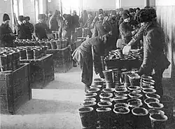 Russia's mobilization rate was low: 10%, compared with 20% in France and Germany. However, the economy was lagging. Aid to the families of mobilized soldiers rose from 191 million rubles in 1914 to 624 million in 1915, plus pensions for widows, orphans, and disabled.[54] The State Bank of the Russian Empire had to print 1.5 billion rubles in the first months of the conflict, and by December 1915, the ruble had already lost 20% of its value.[55] Russia had to borrow from its allies: in October 1915, it received 500 million rubles from the French and 3 billion from the British. In exchange, part of the Russian gold stock, worth 464 million roubles, was sent to the United Kingdom as collateral.[55]