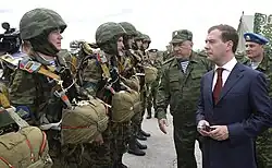 The Airborne Forces are organized into three types of units, consisting of Airborne, Air Assault, and Mountain Air Assault.[5] The airborne units can be parachuted into a combat zone, while the air assault units are airlifted there by aircraft or helicopter.[6] Specifically designated mountain units were created after the Airborne Forces were frequently used in conflicts in the North Caucasus region in the immediate post-Soviet years.[7] The structure of the Airborne Forces uses airborne or air assault divisions for the operational level, airborne or air assault brigades for the operational-tactical level, and regiments for the tactical level. This structure can be augmented with the addition of Ground Forces motorized rifle, artillery, aviation, or other units, depending on the situation.[5]