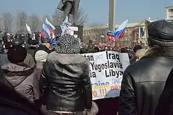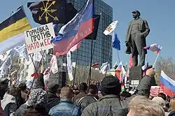 Unrest first gripped Kharkiv city on 22 February 2014, when Euromaidan protesters occupied the Kharkiv regional state administration (RSA) building.[216][217] Later that day, several thousand pro-Ukrainian protesters tried to topple a statue of Vladimir Lenin that stood opposite to the RSA building in Freedom Square. Several taxi drivers defended the monument, injuring several of the protesters. By the next day, several thousand pro-Russian protesters had gathered in the square to protect the statue.[216] They set up a perimeter fence around it. Then governor of Kharkiv Oblast Mykhailo Dobkin made a speech to the defenders of the statue, saying that the statue was "a symbol of our city... we will leave it here and we will defend it".[216] Local police kept Euromaidan and Anti-Maidan protesters apart until 1 March.[218] On that day, pro-Russian activists stormed the RSA building, assaulted the Euromaidan activists who had been occupying it, and raised the Russian flag over the building.[219] Some of the protesters were Russian citizens who had travelled to Kharkiv from Russia.[220][221] According to the local media, 2,000 Russians were brought by buses with Russian number plates to Kharkiv to take part in the storming of the RSA building.[222] Russian activist organizations confirmed that they sent Russians to "peacefully protest" in Kharkiv. Police regained control of the building by evening on the same day, and replaced the Russian flag with that of Ukraine.[223][224]