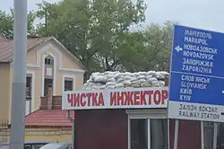A large skirmish erupted in Mariupol on 9 May, when government troops launched an attack on a police station in the city, resulting in the killing of at least twenty people.[154] These were described by the Ukrainian government as "militants" and "terrorists", though some local residents said that they were unarmed protestors.[154][155][156]