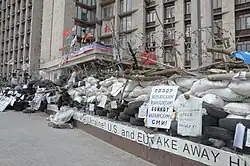 During the Euromaidan revolution there were widespread reports that pro-Yanukovych and pro-Russian 'anti-Maidan' protesters were paid for their support.[49][50][51][52] Oleksiy Haran, a political scientist at Kyiv Mohyla Academy in Kyiv stated that: "People at anti-Maidan stand for money only. The government uses these hirelings to provoke resistance. They won't be sacrificing anything".[53] Russian leader of the extremist Eurasian Youth Union Oleg Bakhtiyarov was arrested for, in part, recruiting rioters for US$500 each to assist in the storming of government buildings.[40] On 13 April, the Internal Affairs Ministry stated that recruiters were found to be paying $500 to take part in the attacks, and roughly $40 to occupy buildings.[54]