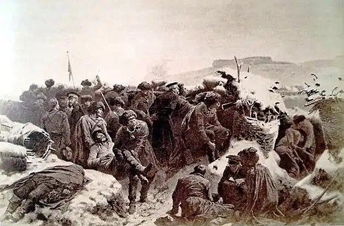 In 1858 the goal was to occupy the Argun River, a north-flowing river 90 km east of the Georgian Military Highway and 35 km west of Veden, thereby cutting off western Chechnya. Unusually for the Caucasus, Shamil never learned of plan. On 15 January 1858 Yevdokimov left Berdikel on the lower Argun. Marching through deep snow he reached Fort Vozdvizhenskoye at the bottom of the first defile.[19] A column marched up the east bank and met valiant resistance, which collapsed when the murids saw an even larger army moving up the opposite bank. The Russians occupied the defile and camped near the modern Dachu-Barzoi where they built Fort Argutinskoye. The axe now replaced the gun. The surrounding auls were burnt, roads and bridges built and trees were cut in all directions. An avenue 1400 yards wide was cut to the crest of the 6000-foot eastern mountain from which one could see Shamil's capital at Veden 10 miles east. Oddly, Shamil remained inactive. Five months later (1 July) the Russians moved on the second 10-mile defile. The murids had fortified it with earthworks and fallen trees. Yevdokimov feinted in that direction and suddenly crossed the river and occupied the western mountain at Lesser Veranda. From there he re-crossed the river to Zonakh, gaining the lower half of the defile. Again they turned to the axe, cutting trees and building roads. On 30 July they broke through south to Greater Veranda, thereby outflanking the defile. They moved down to Shatoy and then north to occupy the second defile. The murids burnt all the auls still in their hands and compelled the inhabitants to retreat with them to Veden. This provoked such anger in the local population that the invader's task became easy. The people of Itum Kale at the head of the third defile revolted and invited the Russians in. Two companies passed the third defile and were hailed as deliverers.[20] The whole Argun was now in Russian hands. Meanwhile, the Russians tried to gather the Ingush around Nazran into a few large settlements. Nazran revolted. Shamil crossed the Argun under Russian fire, could not reach Nazran, and drew back. Six weeks later he tried again with 4000 horsemen. He was defeated, losing 370 dead and 1500 weapons against 16 Russians killed.