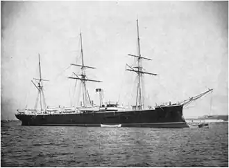 She was a barque-rigged steel and iron ship with a ram bow. She had two unprotected 152 mm (6 in) guns as bow and stern chasers and the other four in unprotected sponsons on the upper deck. Her torpedo tubes were on swivels above water. She was reputedly a good sea boat.[1]