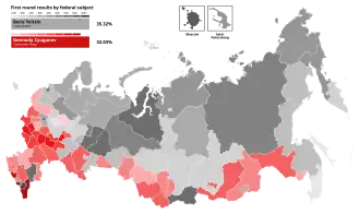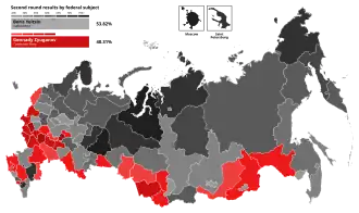 ![]() Second round results by federal subject Yeltsin: 45–50% 50–55% 55–60% 60–65% 65–70% 70–75% 75–80% Zyuganov: 45–50% 50–55% 55–60% 60–65% | |||||||||||||||||