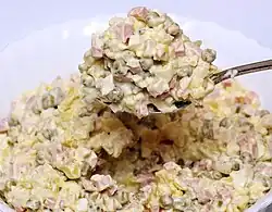 Olivier salad (Russian: салат Оливье, romanized: salat Olivye, ⓘ), also known as Russian salad,[1][2] is a traditional salad dish in Russian cuisine.[2] Its creation is generally attributed to Lucien Olivier.[3][4]