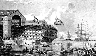 ![]() Ship of the line Rossiya descends into the water | |