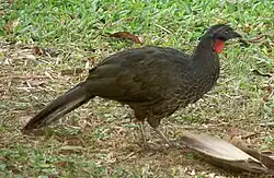 The International Ornithological Committee (IOC) and the Handbook of the Birds of the World taxonomies recognize the four rusty-margined guan subspecies listed in the box to the right. The Clements taxonomy does not recognize P. s. pseudonyma as separate but includes its population in the nominate subspecies.[2][3][4] Birds in Brazil's Alagoas state are distinctive and might be a separate subspecies.[5] The rusty-margined guan and the Marail guan (P. marail) form a superspecies.[6]