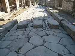 Some of these ancient stone rutways were very ambitious. Around 600 BC the citizens of ancient Corinth constructed the Diolkos, which some consider the world's first railway. The Diolkos was a hard poros limestone road with grooved tracks (wheel-ruts), along which large wooden flatbed cars carrying entire ships and their cargo were pulled by slaves or draft animals. The grooves were at 1.67 m (5 ft 6 in) centres.[2][3]