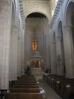 The interior is divided into three naves, leading into three apses, and a transept to the naves thus following the Latin cross plan. The central nave is the largest and is surrounded at the top by a false balcony (it is actually an internal corbel-cornice) which rests on two rows of columns, each one different from the other and of different origins. Furthermore, the columns on the right are cruciform and of greater artistic value than the square ones on the left. On the right columns are represented scenes and stories whose protagonists are mythological men or animals while on the left ones there are floral motifs. At the end of the central nave there is the beautiful ciborium built in the nineteenth century to a design by the architect Ettore Bernich and which is inspired by that of the Basilica of San Nicola in Bari. Furthermore, the central nave and the transept are covered by a trussed roof, while the aisles have a cross vault.
