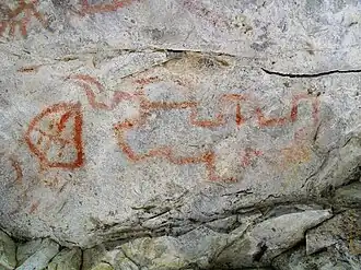 In a rock shelter in Sáchica, rock art in the form of pictographs has been discovered. The archaeologist Eliécer Silva Celis pioneered in the study of them in the 1960s. Later research has been performed by Carl Henrik Langebaek, Diego Martínez, Álvaro Botiva, Pedro Argüello García, and others. The black, red and white rock art is present at an altitude of 2,210 m (7,250 ft) at 5°35′29.058″N 73°31′15.926″W / 5.59140500°N 73.52109056°W and shows human faces, Suns, maize, eyes, mountains, masks, and other figures.[4] The rock art has been produced in rock shelters of Lower Cretaceous formations.[5]