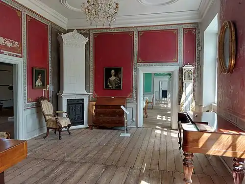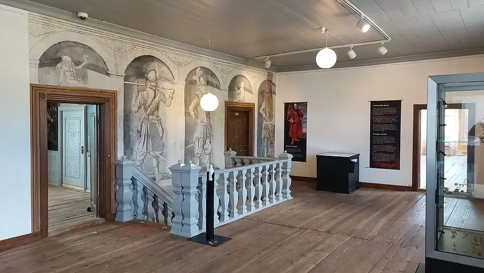 The museum's vestibule features a large runestone from the ninth century. The ticket office is decorated with the interior furnishings of an old grocery shop. A room on the first floor features a set of canvas tapestries with eight scenes from François de Salignac de la Mothe‑Fénelon's 1699 novel Les Aventures de Télémaque. They were most likely installed during Claudius' ownership in 1750–1769. Another mural is based on one of Jacob de Gheyn's illustrations for the 1717 117 engravings for the military manual The Exercise of Armes.[6]
