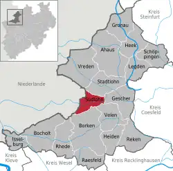 Südlohn (German pronunciation: [ˈzyːtloːn], lit. 'South Lohn', in contrast to "North Lohn") is a municipality in the district of Borken in the northwestern part of North Rhine-Westphalia, Germany. It is located right at the border with the Netherlands, approx. 10 km east of Winterswijk. It consists of the villages Südlohn and Oeding.