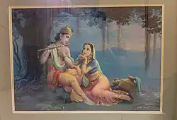 Sambanand Monappa Pandit (25 March 1916 – 30 March 1993) was an Indian painter from Karnataka, popular in the school of Realism in contrast to the contemporaneous net-traditionalist Bengal Renaissance and other Indian modern art movements of his time. Most of his subjects oscillated between events from classical Indian literature including the Ramayana, the Mahabharata, the Puranas, and the contemporary cinema of his times. He infused a rare blend of artistic virtuosity and filmi glamour to his portrayal of romantic characters like Radha-Krishna, Nala-Damayanti, and Viswamitra-Menaka as also the many heroes and heroines of Hindi cinema. In addition to his critically acclaimed masterpieces he also illustrated many popular film posters, film magazines and various other publications in what can collectively be termed as calendar art. His works remain hugely popular even today.[1] His mythological paintings and calendar art have been collected widely. He is also widely celebrated in the Indian calendar industry for his "realistic" depiction (albeit inspired by contemporary Indian cinema) of themes from Hindu mythology. In these paintings he emphasised the physical forms of the heroes, heroines, gods and goddesses in marked contrast to traditional and classical styles of Indian painting. In his paintings, Pandit depicted his subjects as handsome, muscular, valorous men and sensuously beautiful, voluptuous women set in surroundings suggestive of cinema settings and sceneries.