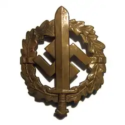 The SA Sports Badge (German: SA-Sportabzeichen) was a decoration of Nazi Germany that was issued between the years 1933 and 1945. It was a political version of the much more generic German Sports Badge, which was also issued in great numbers by the Nazis.[1] At its center was a 57mm high Roman broad sword, superimposed over a Nazi swastika encircled by a wreath of oak leaves. It was a pin-back badge, but there was a cloth version, as well.[2]